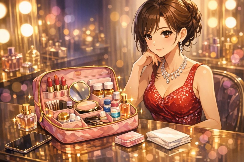 キャバクラで一番重要な持ち物は「メイク直し用品」です。お酒・汗・熱気でメイクは必ず崩れます。お手洗いのたびに直せるアイテムを常備することが清潔感を保つ最大の方法です。